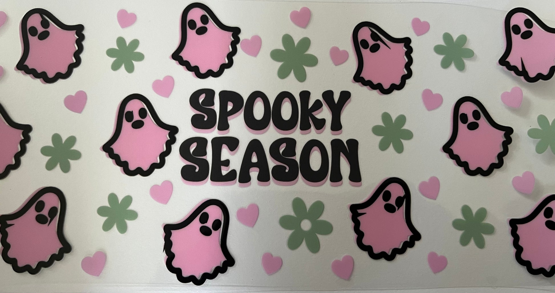 Halloween decal Spooky Season with pink ghosts and flowers.